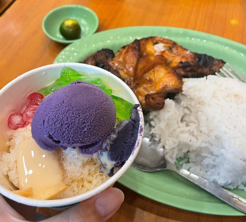 手前がハロハロ(かき氷、アイス、ゼリー、ミルク、フルーツを盛り込んだカラフルなデザート)です。