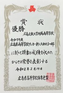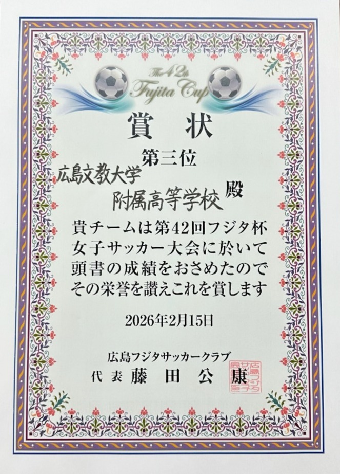 サッカー部が『令和7年度広島県高等学校サッカー新人大会 女子の部』の大会と『第42回フジタ杯女子サッカー大会』に出場しましたので、その結果を報告します。 『令和7年度広島県高等学校サッカー新人大会 女子の部』は2月14日にAICJ高校と決勝が行われ、1-0で文教高校サッカー部が優勝しました。 翌日の15日には『第42回フジタ杯女子サッカー大会』の3日目があり、文教高校 – サンフレッチェ広島レジーナユース、サンフレッチェ福山レジーナジュニアユース – 広島大学の4チームで戦い、惜しくも3位になりました。 皆さま、ご声援ありがとうございました。