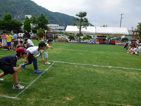 B組のかけっこ、笛の音をしっかりきいて、全力でトラック一周を走りきりました。
