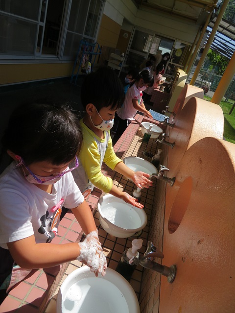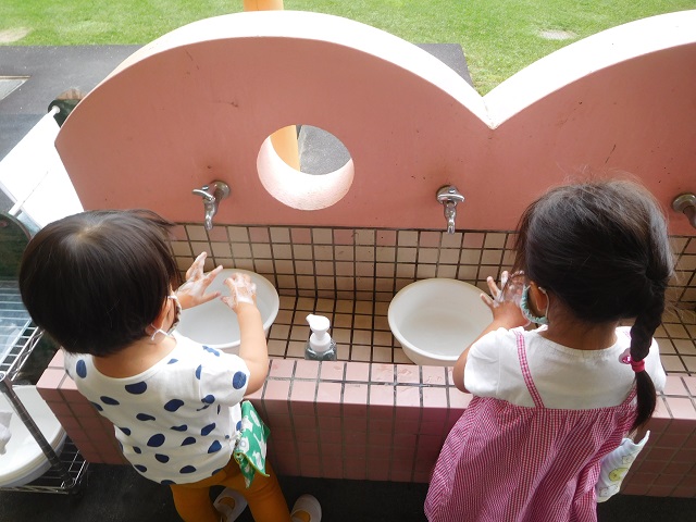 新しい子どもには、担任が一緒に知らせながら手洗いをしています。