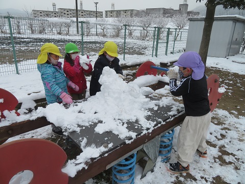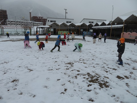 園庭に出て、積もったばかりの雪を気持ちよさそうに触ったり、雪合戦をしたり、雪だるまを作ったりしてました。この季節ならではの雪遊びを満喫しました。
