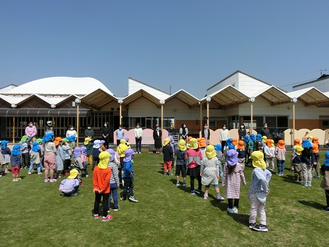 バッチの色が変わり、ひとつ大きくなって登園してきた子どもたち、職員と子どもたちみんなで集まって、お話を聞きました。