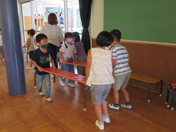 ベンチを片づけるのも 友だちと協力して...誰とでも協力できるよ