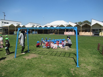 たまごホールにみんなで集まり、園長先生からお話を聞きました。