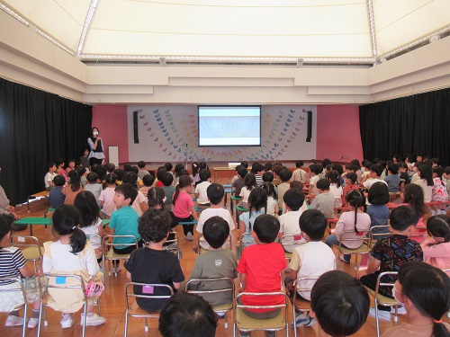 全園児がたまごホールに集まって、年長児の胸はドキドキ!!