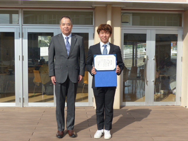 まず始めに、広島文教大学学生表彰規程に基づき、心理学科2年生小原泰誠さんの学生表彰式を行いました。