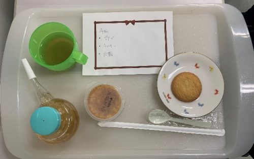 次は、準備した食事(今回は間食の設定で、クッキー、プリンやゼリー、お茶でした)を実際に見ていただきながら、メニューの説明と同意を得ます。口に運ぶ前にどれから食べたいか、本人の意思を確認します。また、首が後ろに反っていないか、あごは引いているか等、食事姿勢も気をつけながら介助を行います。