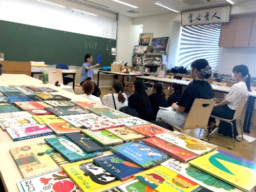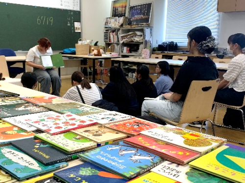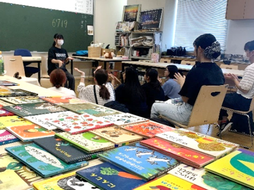 人間福祉学科保育士資格取得科目「保育演習内容演習Ⅱ」では、育児サークルや幼稚園・保育園・小学校・広島市図書館・広島市児童館でのおはなし会や絵本の読み聞かせ・ブックトーク・ストーリーテリング・わらべうたの経験をもつ講師が、その経験を生かして、いろいろなシチュエーションにおける具体的な方法について指導するとともに、人の前で絵本を読む・わらべうたを歌う技術に関する体験的な学びを指導しています。