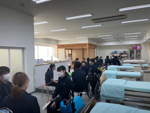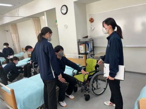 そして当日は、1年生2人~3人に対して4年生1人が指導者として、事例に対する介護技術のレクチャーを練習通り取り組む姿が見られました。また、1年生も4年生に対して、質問を投げかけ、できない実技は何度も取り組む姿が見られました。学年を越え相乗効果のある学びの時間になりました。