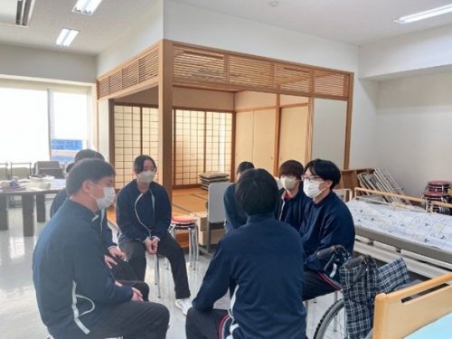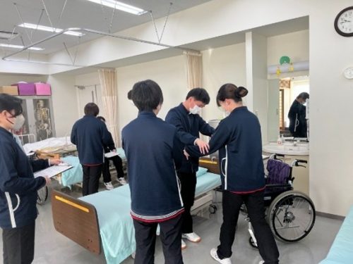 そして当日は、1年生2人~3人に対して4年生1人が指導者として、事例に対する介護技術のレクチャーを練習通り取り組む姿が見られました。また、1年生も4年生に対して、質問を投げかけ、できない実技は何度も取り組む姿が見られました。学年を越え相乗効果のある学びの時間になりました。