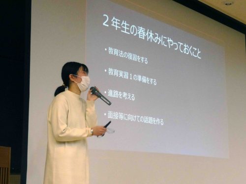 幼小教諭専門部会長による挨拶,教採に向けた心構えの話からはじまり,4月から小学校の教壇に立つ予定の教育学科4年生からは教員採用試験の実際,2年生の春休みにやっておくこと,教育実習のことなどといった具体的な話がありました。