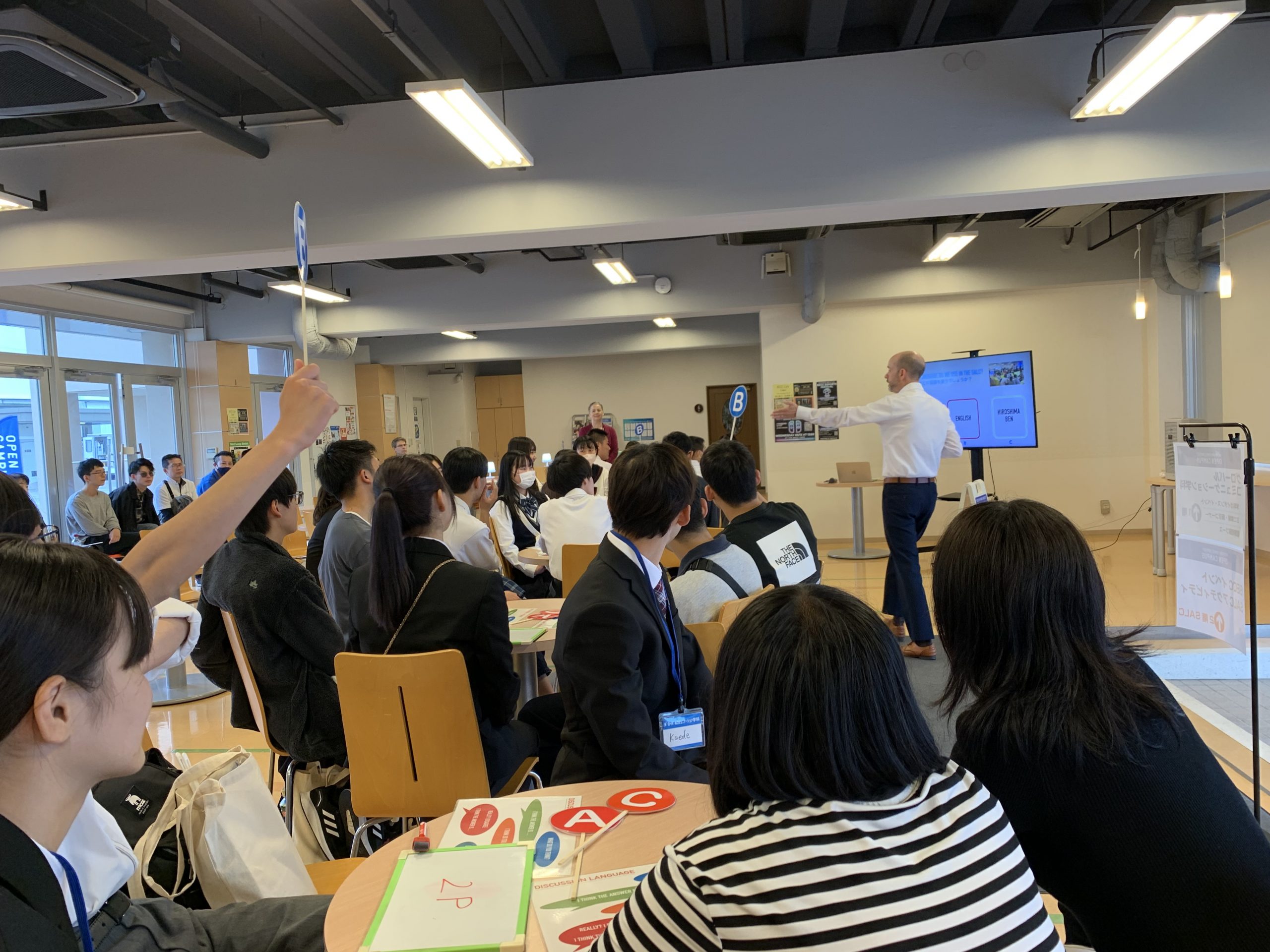 まず学科長の宮崎先生から、グローバルコミュニケーション学科での活動や授業の内容、来年度から始まる全員留学制度の説明などが行われました。次にBECCのレノ先生による学科イベントが、学生スタッフ、BECCの先生とともに行われました。