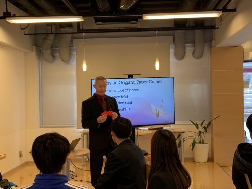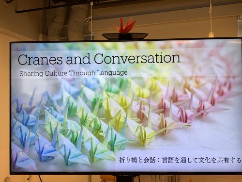 学科長挨拶に続いて入学前課題の説明が行われ、入学前の学びについて確認したのちに、メインイベントとして、グループに分かれて「Cranes & Conversation:Sharing Culture Through Language(折り鶴と会話:言語を通して文化を共有する) 」という、英語で説明しながらツルを折るアクティビティに取り組みました。