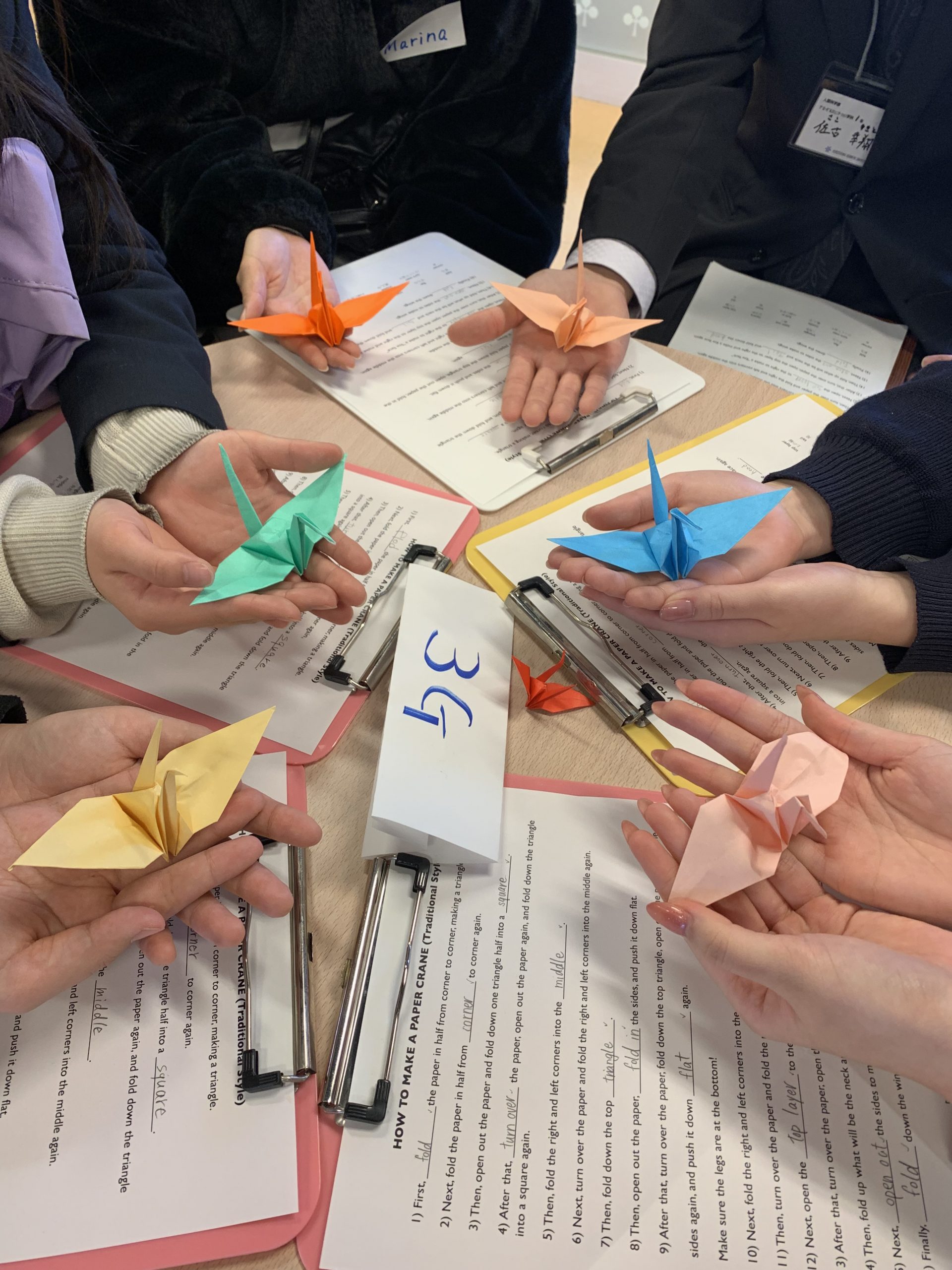 グループワークでは笑顔や笑い声のあふれる楽しい時間となりました。「留学の時、海外の友達と一緒にツルを折れるように、折り方も英語の説明も練習する」と、参加者も、サポート学生も、ともに留学への意気込みや留学に向けての意欲的な英語学習について笑顔で想いを語ってくれました。