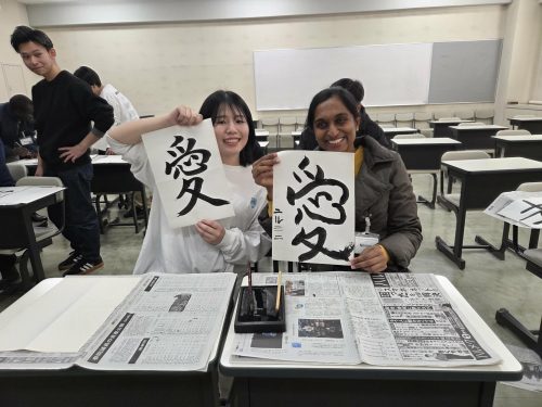参加したグローバルコミュニケーション学科4年の福井さんは、「英語でコミュニケーションをとるいい機会となりました。アメリカ英語に慣れているので、英語は世界の言語であることを実感しました。」同学科4年の田中さんは、「改めて英語が現代を生きていく中で必要だと感じました。同時に自分の英語力にも自信がつきました。」同じく4年の下種さんは、「書道をずっと続けてきたことが役立ちました。私の字をお手本に書いてもらって、とてもうれしかったです。」と語っています。