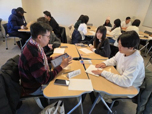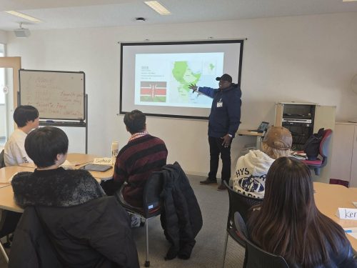 1月14日、5名のJICA研修員が本学にやって来ました。ケニア、バングラディッシュ、カンボジア、スリランカ出身の広島大学大学院で学びを深めている方々です。すべて英語でコミュニケーションをとるにあたり、グローバルコミュニケーション学科の学生たちは五感を働かせる一日となりました。