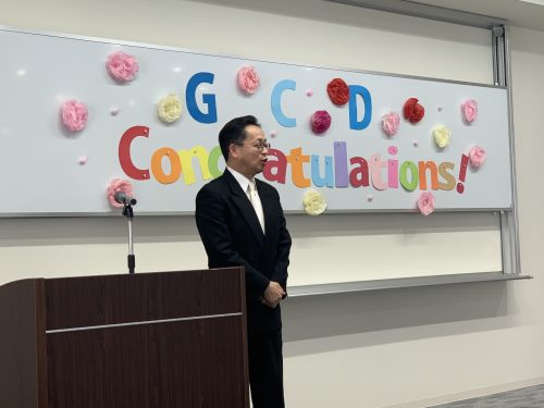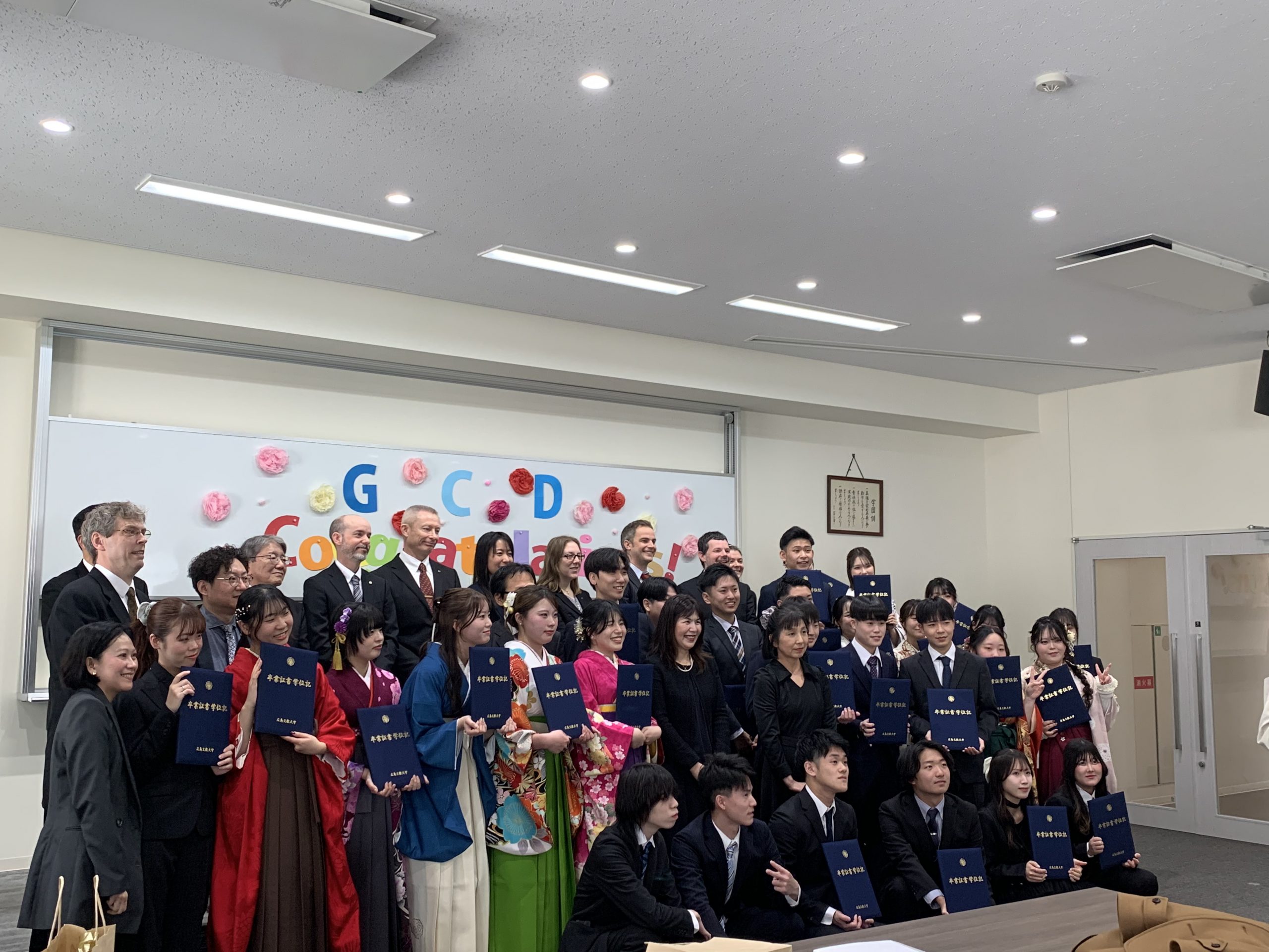 学科別卒業式では、学科長より卒業生へお祝いの言葉が贈られました。その後、チューターの呼名による学位記授与式が行われ、続いて、BECC教員から、お祝いのメッセーが贈られました。