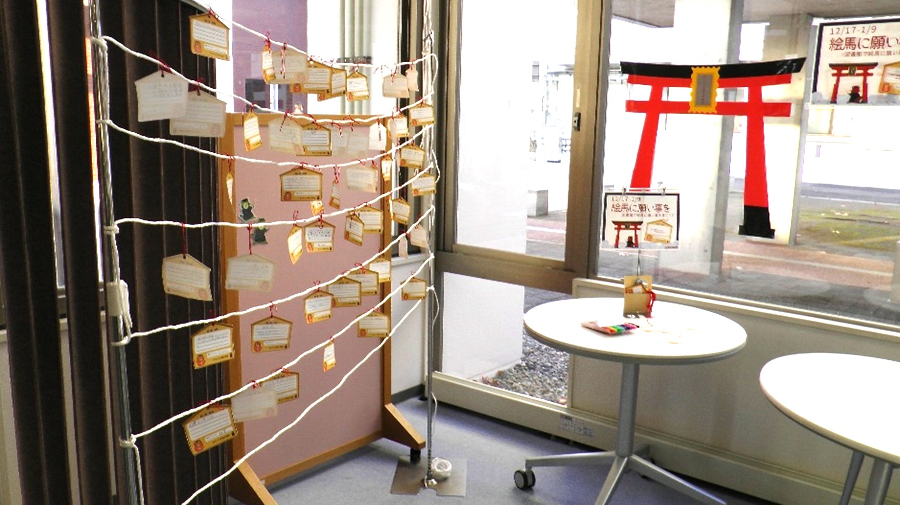2025年12月17日(水)から2026年1月9日(金)まで、図書館1階ラーニング・コモンズに、「絵馬」と「絵馬掛所」を設置し、利用者のみなさんに新年の願い事や抱負を書いて掛けていただきました。