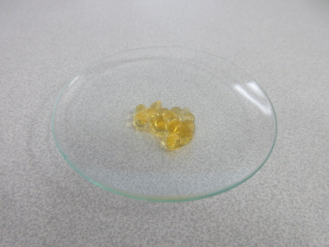 熱純水で調製したアルギン酸ナトリウム溶液を、メチルオレンジでいくらの色に着色し、駒込ピペットを使用して塩化カルシウム溶液に滴下しました。そして、生成された人工いくらの見た目や触感などを観察しました。