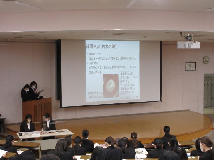11月20日(土)に、4年生の「給食経営管理臨地実習Ⅱ」、3年生の「給食運営臨地実習」の報告会を開催しました。今回の報告会より3年生が司会進行や会場設営などの運営を担当しました。