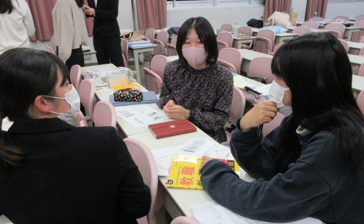 質疑応答の際には後輩からの積極的な質問も見られました。これから自分たちが行う教育実習への心構えが伝わってくる大変有意義な質疑応答となっていました。報告会終了後、今年度の教員採用試験の取り組みについての助言や、教職課程全般の質問を受ける時間として、4年生と後輩たちの座談会が行われました。実際に教育実習に行った先輩方の話を聞くことができ、栄養教諭を目指す後輩たちの良い刺激になりました。