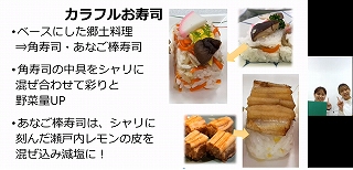 考案したメニューは広島県の郷土料理・特産品を生かした3品で、1品目は「カラフルお寿司」で郷土料理の角寿司とあなご棒寿司を土台に、2品目は「ごろごろ具材牡蠣の味噌汁」で牡蠣の土手鍋を土台にしてコンテスト条件に合うように工夫と改善を行いました。3品目は「小いわし達の天ぷら」で「ちりめんじゃこ」と「祇園パセリ」のみじん切りを天ぷら衣に加え、天つゆがなくても食べられる天ぷらにしました。