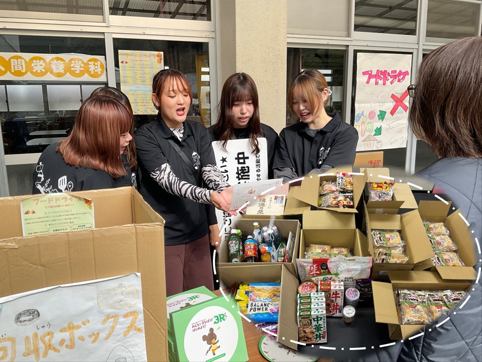 人間栄養学科の1年生が入学後初めての社会貢献活動として取り組んでいた、本年度のフードドライブ活動が終了しました!フードドライブ活動とは、ご家庭で余っている食品を学校や職場に持ち寄り、地域の福祉団体や施設に寄付する活動のことです。
