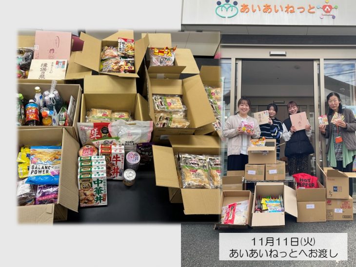 11月11日(火)に、文教祭・広島文教大学附属幼稚園・同大学附属高等学校で実施したフードドライブ活動で回収した食品を、「社会福祉法人 正仁会 フードドライブ事業 あいあいねっと」様へお渡しに伺いました。