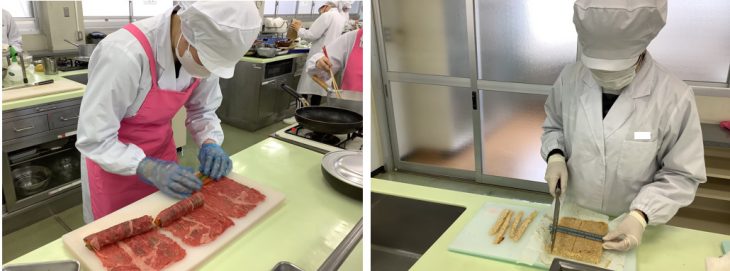 応用調理学実習では行事食の他にも、減塩食や低脂肪食、介護食などにも取り組んでいます。3年生で受講する給食経営管理実習での大量調理や臨地実習に繋がる様々な献立や調理技術を更に学んでいきます。