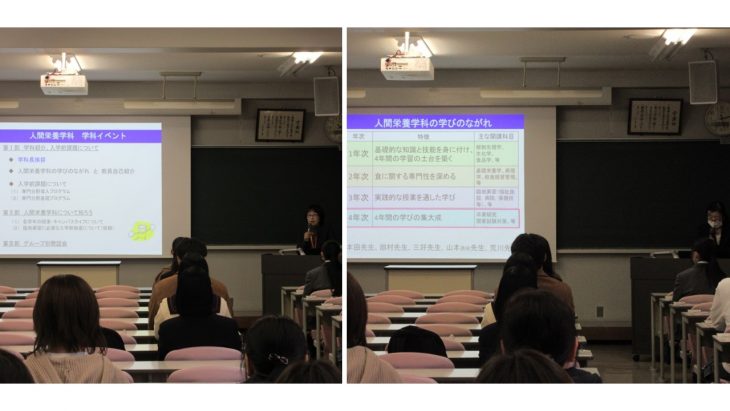 第Ⅰ部では、学科長の挨拶の後、学科教員より人間栄養学科の学びと入学前課題について説明がありました。