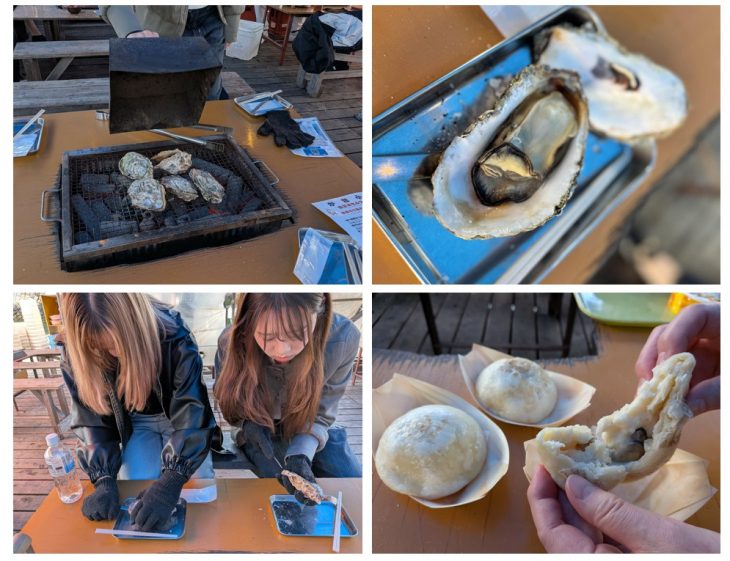 牡蠣小屋では焼き牡蠣の殻をはずし、丁寧に養殖された牡蠣を味わいました。殻の外し方に苦戦しましたが、うま味の凝縮したプリプリの牡蠣に学生たちは感動していました。その他、フライや天ぷら、グラタン、牡蠣飯、佃煮、すまし汁、チャーハン、かきグラまんなどの牡蠣料理を堪能し、牡蠣料理のバリエーションの豊かさに驚いていました。
