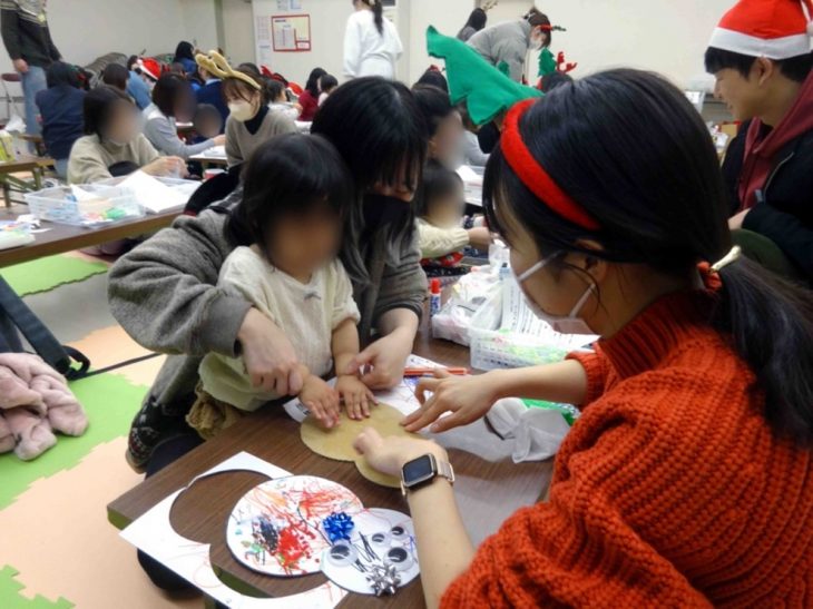 広島市南観音公民館で行われている子育て支援事業「なんかん子育て広場げんきっず」において、教育学科・図画工作ゼミ2〜4年生20人と佐伯育郎教授による「ミニクリスマス会」を2023年12月6日(水)に開催しました。3か月から2歳9か月までの20人の子どもたち、18人の保護者の方が参加してくださいました。