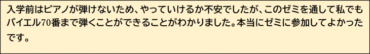 毎年、前期と後期に開講している本学のピアノゼミは、受講者の満足度が高く、前期末にも次のような感想が寄せられています。