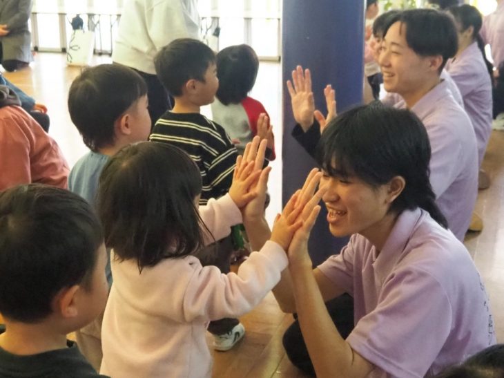 令和8年1月21日(水),雪がしんしんと降るなか,広島市立八木幼稚園の子どもたちが附属幼稚園へ遊びに来てくれました。幼児教育コースと児童教育コースの音楽ゼミ2・3年生が企画した,音楽演奏会に招待したためです。附属幼稚園のたまごホールには,2つの園の子どもたちが一堂に会しました。