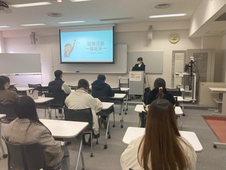 就職活動を終えた4年生から,就活が始まる3年生に向けて,就活に関するエピソードやアドバイスをしてもらう企画です。また,大学院に合格した4年生には合格体験記を話してもらいました。3年生は小グループにわかれて,先輩の話を聞きました。また,質疑の時間には,3年生からもいろいろな質問が4年生に投げかけられていました。