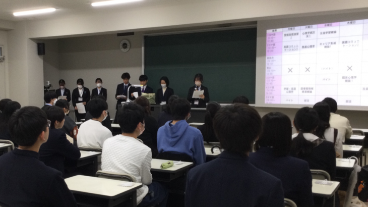 引き続き、心理学科1年生の先輩のみなさんからは、心理学科での学びの様子(時間割や授業の内容、先生の雰囲気など)はもちろん、サークル活動やアルバイトの様子、寮生活や下宿生活の様子など、入学前に知っておくとよいことについて、スライドを駆使した発表がありました。このように頼れる先輩がたくさんいることも、本学科の強みの一つです。