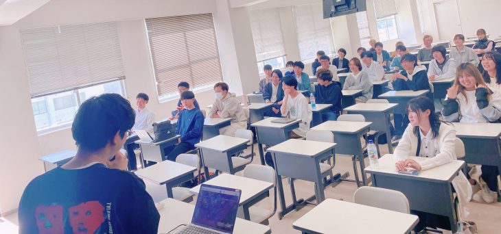 入学してすぐの1年生前期には、この力に対応した「ソーシャル・スキル演習」の授業があり、まず初めに一人ひとりが1年生全員の前で自己紹介発表をするという演習が行われました。
