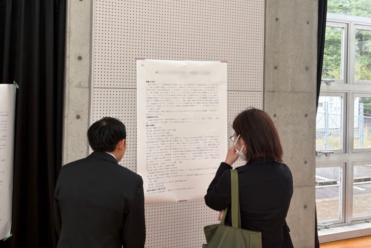 当日は、学内の体育館にて研究の進捗状況の報告が学会のポスター発表の形式で行われました。