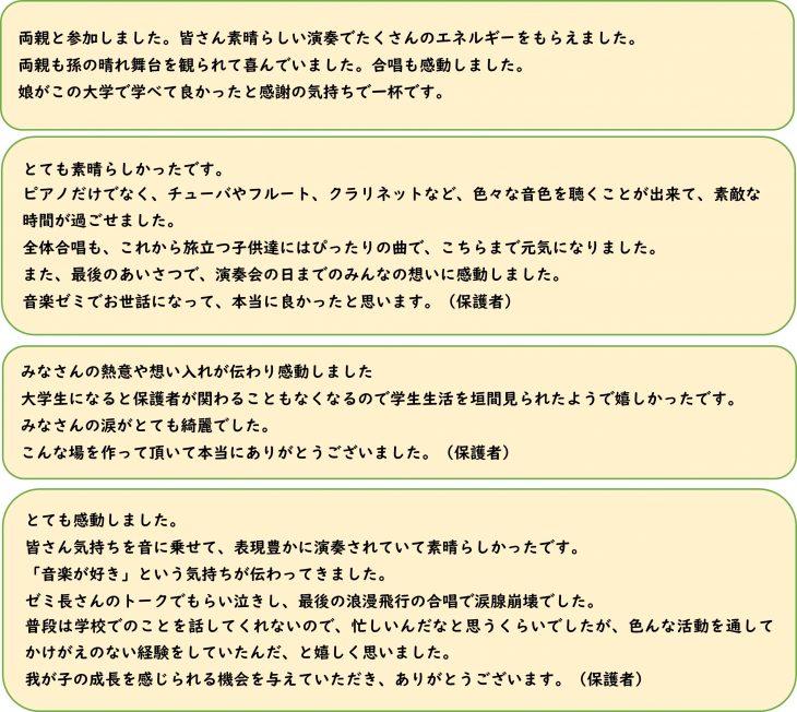 私たち音楽ゼミが、心を尽くし、多くの時間をかけて準備をしてきたこの卒業演奏会。4年間の集大成として、一人ひとりが誠心誠意、取り組んできた成果を披露しました。