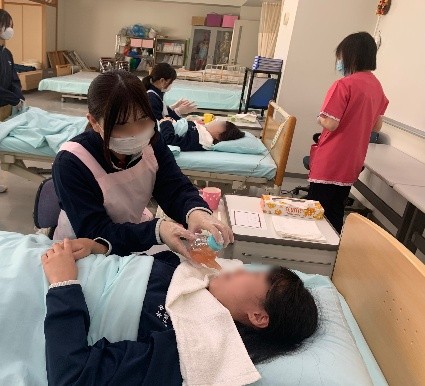 今回は、「ベッド上で行う食事の援助」として、利用者がベッドに横になったままの状況を設定し、間食としてジュースやクッキーなどを食べていただく援助を工夫しながら実施しました。