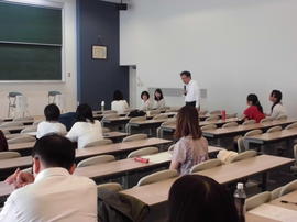 まずは学科長による歓迎の挨拶ののち、学科教員よりそれぞれの専門領域や担当科目などについて紹介がありました。また、サポーターの在学生も自己紹介しました。